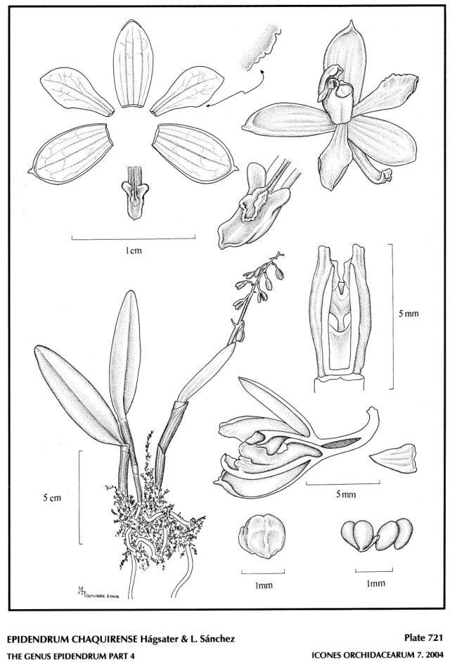 " Epidendrum chaquirense belongs to the GROUP Mancum SUBGROUP Mancum, which is characterized by the sympodial growth, narrow spathaceous bracts with parallel sides, erect raceme with non-resupinate flowers and a generally reduced, fleshy lip. The species can be recognized by short plants, 6" [15 cm] tall, with one leaf per stem, rhombic petals, .12 to .128" [3.0 to 3.2 mm], crenulate towards the apex. It is similar to Epidendrum sarcodes from Colombia, Cordillera Oriental around Bogotá; but this species has taller plants 14 to 16" [35 to 40 cm] tall, with 4 to 6 leaves per stem and spatulate petals, .72 to .8" {1.8 to 2.0 mm] wide with the entire margin. Epidendrum mancum Lindl. has smaller plants, leaves and flowers, and an entire, reduced lip. Epidendrum sarcoglottis Schltr. is distinguished by the entire, acute, claw-like lip, with a concave, transverse platform-like callus, and linear-oblanceolate petals." Hagsater etal 2004