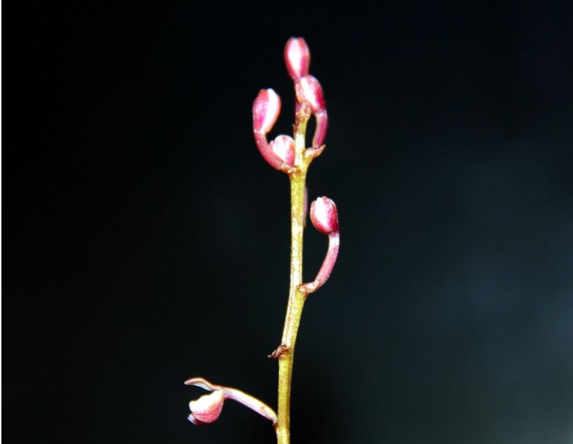 Found in southern Colombia on the Cordillera Occidental on the eastern slope of the Andes at elevations around 1800 to 1900 meters as a medium sized, cool growing terrestrial with a few branched above when mature, erect, straight, terete, thin, single branched stem carrying 7, all along the primary stem, articulate, patent, spreading, elliptic, obtuse, margin entire leaves that blooms in the summer on a terminal, paniculate, occasionally racemose, erect, peduncle short, terete thin, basally with one lanceolate, acute, clasping bract, rachis 6.8" [17 cm] long, very slightly flexuous, greenish brown, successively 1 to 3, 11 to 31 flowered inflorescence with much shorter than the ovary, triangular-lanceolate, acuminate, clasping, spreading brown floral bracts and carrying non-resupinate flowers with externally fuschia-wine red sepals internally pale pink, the petals pale pink and the lip and column are pinkish white.