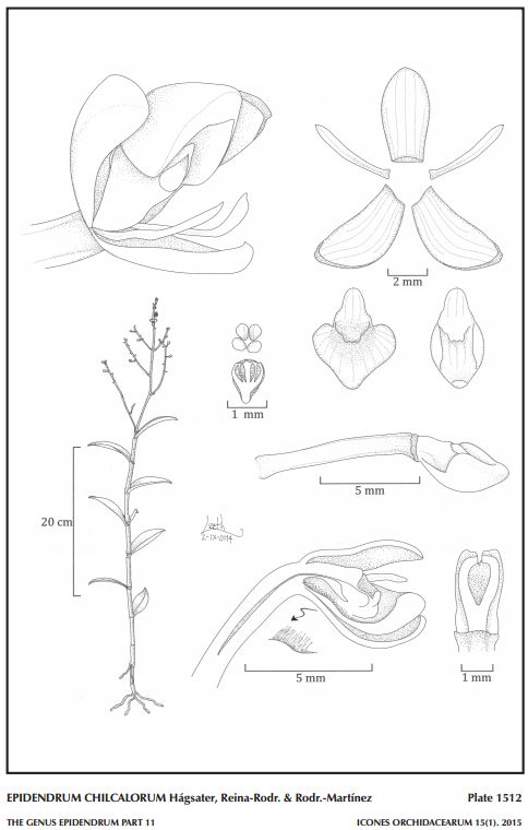 "Epidendrum chilcalorum belongs to the GROUP Elleanthoides SUBGROUP Pilcuense which is recognized by the thin, monopodial stems, branching above when mature, sheaths rugose, inflorescence apical, erect, paniculate, lax-flowered, lacking any spathe, small flowers, and sub-entire to deeply 3-lobed, fleshy lip embracing the apex of the column, 1 callose, the disc of the lip and floor of the nectary opposite the stigmatic cavity pilose. The species is recognized by the elliptic leaves 1.21 to 2.64" [4.4 to 6.5 cm] long, the color of the flowers, the sepals externally fuchsia-wine-red, internally pink, the column and lip pinkish-white; the sub-entire, cordiform lip wider than long, with a single, laminar callus, the apex 3-lobulate, and the 5-veined sepals, apically rounded. Epidendrum pilcuense Hágsater & Dodson, has lanceolate leaves about twice as long 3.6 to 4.8" [9 to 12 cm] long, yellowish white flowers with purple punctuation, and ochre-yellow, deeply 3-lobed lip smaller, .14 x .18" [3.5 x 4.5 mm], callus entire, rounded, and sepals 3-veined, acute. Epidendrum grayi Hágsater & Dodson has similar sized linear-lanceolate leaves, pale orange colored flowers, deeply 3-lobed lip, bilobed callus, and the sepals 3-veined, obtuse." Hagsater etal 2015