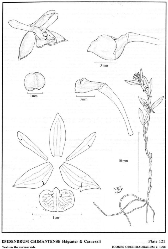 "Epidendrum chimantense belongs to the GROUP Arbuscula SUBGROUP Arbuscula and can be recognized by the purple-tinged leaf sheaths, the narrow, elliptic-lanceolate leaves, and the successive, small flowers with subreniform, somewhat emarginate, apiculate lip. The species has been confused with Epidendrum lechleri Rchb .f., a species native to Peru which has sepals .52" [13 mm] long and entire lip. Epidendrum nephroglossum Schltr. has very prominent floral bracts, sepals .44 to .5" [11 to 12.5 mm] long and the lip is reniform .28 x .52" [7 x 13 mm], with the base cordate." Hagsater etal