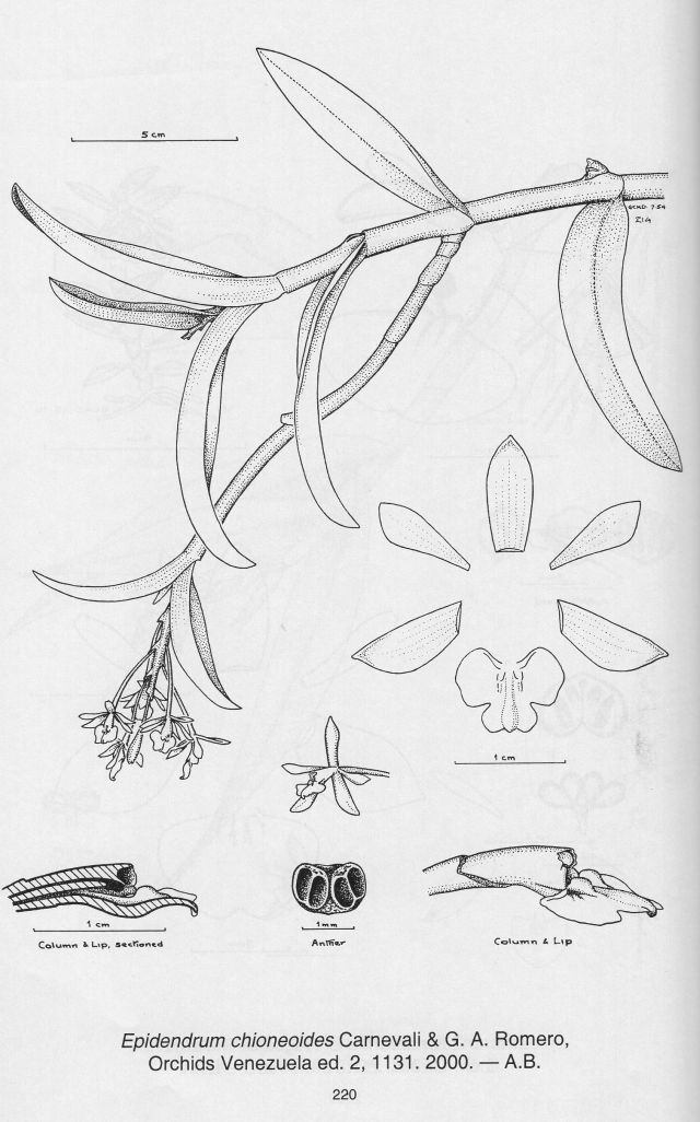 References W3 Tropicos, Kew Monocot list , IPNI ; Venezuelan Orchids Illustrated Vol 1 Dunsterville & Garay 1959 as E moyandae not = E chioneoides; Flora of Venezuela Vol 15 Parte 3 Foldats 1970 drawing not = E chinioides; Orchids of Venezuela, an Illustrated Field Guide Vol 2 Dunsterville & Garay 1979 as E moyandae drawing fide; Orchids of Venezuela, an Illustrated Field Guide Vol 2 Second Edition Romero & Carnevali 2000 drawing fide; *Orchids of Venezuela, an Illustrated Field Guide Vol 3 Second Edition Romero & Carnevali 2000 drawing fide; Icones Orchidacearum 12 Plate 1211 Hagsater 2009 see recognition section; Icones Orchidacearum 12 Plate 1237 Hagsater 2009 see recognition section;