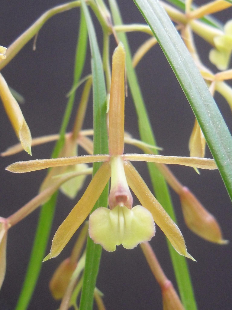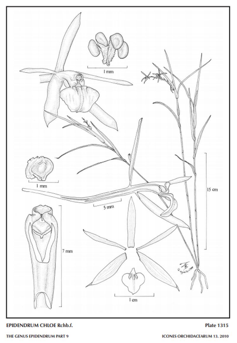"Epidendrum chloe belongs to the GROUP Chloe which is characterized by the sympodial, caespitose plants with simple, very thin stems, grass-like, acuminate, sub-erect leaves, a racemose, lax, few-flowered inflorescence, and delicate flowers with a more or less cordate lip. The species is recognized by the copper-colored flowers, the somewhat 3-lobed lip, with hemi-elliptic lateral lobes and mid3-lobe apiculate.Epidendrum culmiforme Schltr. and E. wendtii Hágsater & Salazar are vegetatively very similar, but the plants are somewhat larger, with an entire, ovate-cordiform to ovate-triangular, acute lip." Hagsater etal 2010