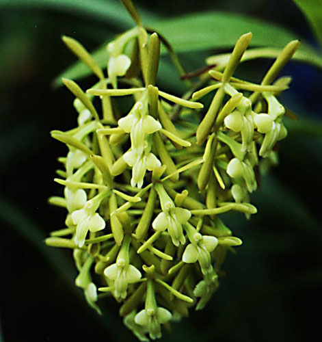 Found in Sinaloa, Nayarit, Jalisco, Colima, Michoacan, Mexico, Guerrero and Oaxaca states of Mexico on the Pacific slopes at elevations of 350 to 1700 meters as a small to large sized, hot to cool growing epiphyte with simple, cane-like, terete to somewhat laterally compressed, straight stems carrying 6 to 15, distichous, throughout the apical 2/3's of the stem, coriaceous, elliptical to ovate, entire marginally, spreading leaves that blooms in the early spring through mid winter on a terminal, erect, pluri-racemose, dense, terete, smooth, 3" [7.5 cm] long, 15 to 30 flowered inflorescence enveloped by 2 to 5 imbricating, tubular, oblong-triangular, acute to acuminate bracts and shorter than the ovary, progressively shorter apically, ovate-triangular, acute floral bracts and carrying simultaneously opening, resupinate flowers that yellow with age.