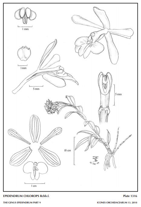"Epidendrum chlorops belongs to the GROUP Anceps , which is recognized by the simple stems, generally elongate, compound racemose inflorescence producing new successive racemes with time, fleshy flowers, filiform to narrowly spatulate petals, and the SUBGROUP Polyanthum which has elongate, not sub-corymbose racemes. The species is recognized by the terete, somewhat laterally compressed stems, green to ochre green-flowers turning yellowish with age, smooth ovary, 3-veined petals, 3-lobed lip, the lateral lobes sub-orbicular- elliptic, entire with evident basal thickened veins, the mid-lobe oblong-rectangular, slit. Epidendrum clowesii Bateman ex Lindley, which grows along the Pacific slope of southern in Oaxaca and Chiapas states of Mexico, Guatemala and El Salvador, has laterally compressed stems, smaller, olive-green flowers, sometimes tinged with brown, the lip greenish white without thickened veins, the sepals .32 to .6" [8 to 9 mm] long and the lateral lobes of the lip without thickened veins. Epidendrum motozintlensis Hágsater & L.Sánchez, endemic of Chiapas state of México, has laterally compressed stems, small green flowers with a greenish-white lip, .272 to .312" [6.8 to 7.8 mm] long sepals, filiform petals, and a short, transversely rectangular mid-lobe of the lip with a shallow apical sinus. Epidendrum polyanthum Lindley, from Mexico, Belize, Guatemala, El Salvador and Honduras has larger, orange-yellow flowers with sepals .32 to .4" [8 to 10 mm] long, the lateral lobes of the lip semi-ovate, with a small sinus in the margin, and the mid-lobe oblong-quadrate, with the apex emarginate." Hagsater etal 2010