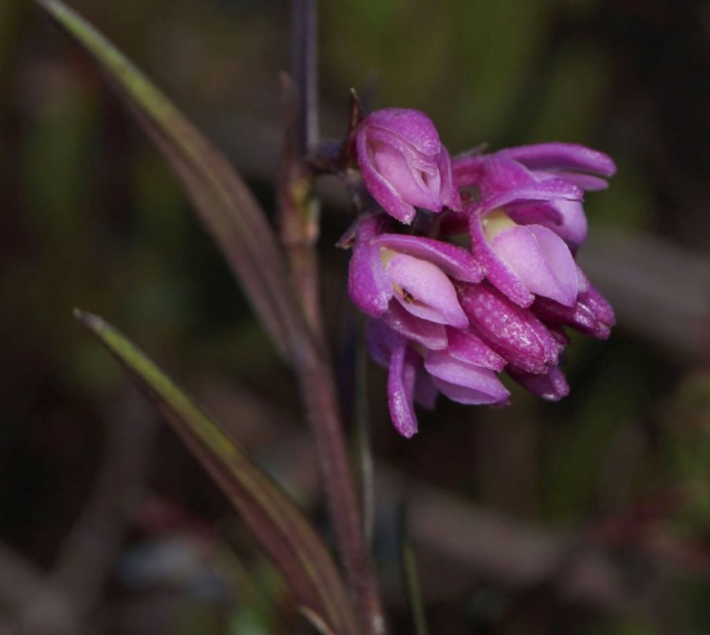 Found in north-eastern to central Peru, where it grows both in elfin forest and Andean tepui vegetation in shrub patches at elevations of 2850 to 3776 as a medium sized, cold growing terrestrial and occasionally as an epiphyte with cane-like, terete, scarcely branching above, branches 8.8 to 12" x .6 to .8" [22 to 30 × 0.15 to 0.20 cm], the first 3 to 4 internodes covered by leafless sheaths and carrying 17 to 19 on primary stem, distributed throughout, erect, parallel to the stem, at flowering the upper half present; 13 to 15 leaves on the branches; tubular, rugose; blade narrowly lanceolate, acute, coriaceous, margin finely crenulate, spreading when fresh, margin strongly revolute when dry leaves that blooms at most any time of the year on a terminal, without a spathe, peduncle .44 x .08" [11 × 2 mm], short, thin but not thread-like, with a large flat bract near the middle, .44 x .08" [11 × 2 mm], 2.4 to 4" [6 to 10 cm] long overall, apical, racemose to paniculate, arching-nutant, can produce new racemes even when the previous raceme is still in flower, successive developing together with the rachis, 2 to 4 open at once, 19 per raceme, many flowered inflorescence with progressively shorter, triangular, acuminate, shorter than the ovary, embracing floral bracts and carrying deep pink (fuchsia) colored flowers with the lip always turned towards the rachis, fleshy, disc of the lip white, column white at apex, green towards the base; without fragrance.