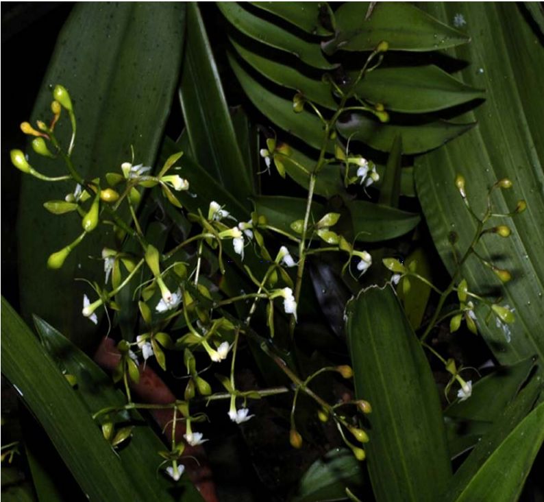 Found in southern Ecuador and northern Peru at elevations of 1400 to 1600 meters as a small sized, cool growing epiphyte with simple, cane-like, terete, erect, straight stems carrying 13 all along the stem, distichous, articulate, erect-spreading, unequal in size, basally and apically smaller, narrowly lanceolate-elliptic, shortly acuminate, margin entire, spreading leaves that blooms in the summer on terminal, erect, paniculate, peduncle 1.4" [3.5 cm] long, thin, somewhat laterally compressed, erect, straight, enveloped by 2, tubular, acute, partly imbricating bracts, rachis 1.72 to 2.76" [4.3 to 7.65 cm] long, to 8" [20 cm] long, overall, laxly, simutaneously to 50 flowered inflorescence with small, much shorter that the ovary, narrowly triangular, acuminate, amplexicaul floral bracts and carrying resupinate, pale green with the lip and the apex of the column white.