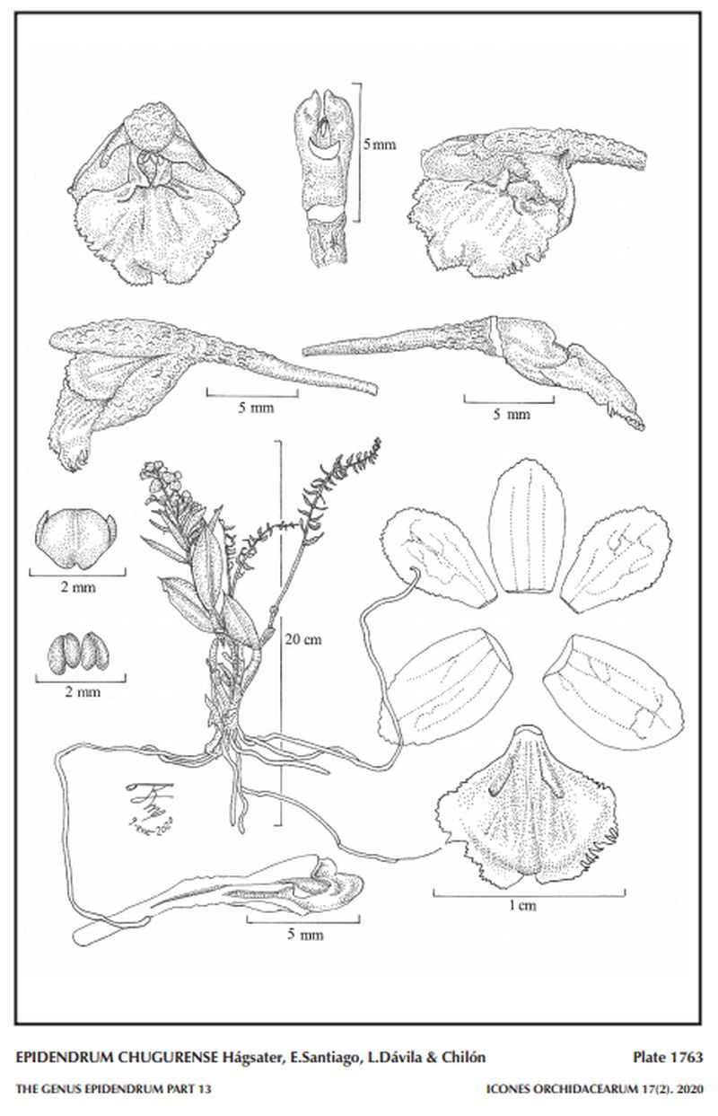 "Epidendrum chugurense belongs to the GROUP Rupestre , which is characterized by caespitose, sympodial plants, pseudobulbous stems with 1 to 4 fully developed leaves toward the apex, the lack of spathes at the base of an erect, racemose or paniculate inflorescence, and the lip ecallose or bicallose and with several fleshy thickened keels on the disc. The new species is recognized by the elliptic leaves, the many-flowered, racemose inflorescence with 20 to 36 greenish yellow flowers, the sepals dorsally pustulate, the petals .16" [4 mm] wide, obovate, apical margin crenate, and the lip pentagonal with irregularly dentate margin, with the two prominent calli laminar, divaricate and a single thickened mid-rib. Epidendrum aida-alvarezii has narrowly elliptic to oblanceolate leaves, 10 to 15 yellow flowers, petals .048" [1.2 mm] wide, oblanceolate, and a lip obscurely 3-lobed, hexagonal, with 2 ellipsoid calli and 3 parallel ribs on the disc." Hagsater etal 2020