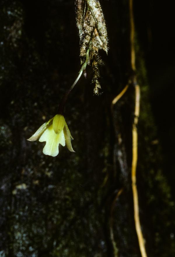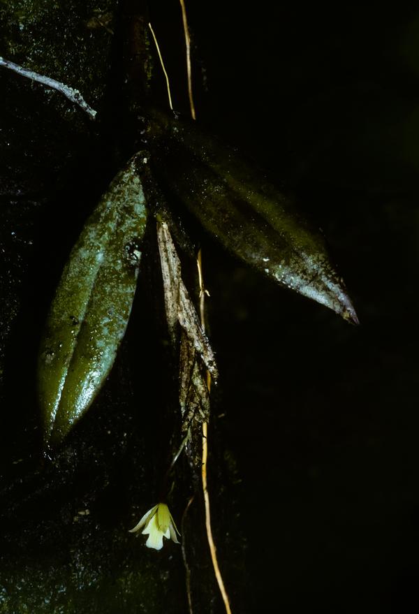 Found in Colombia and Venezuela in fairly tall rainforests at elevations around 400 to 600 meters as a small to medium sized, hot to warm growing epiphyte with cane-like, simple, basally terete, compressed above stems carrying 3 to 5, all along the upper 1/2 of the stem, coriaceous, lanceolate, acute, basally clasping leaves that blooms on a terminal, occuring only once, on a mature stem, racemose to occasionally branched, terete to subterete, to 3" [7.5 cm] long including the elongating peduncle to 2" [5 cm] long, successively single flowered inflorescence enveloped completely by imbricating, compressed, grey green bracts.