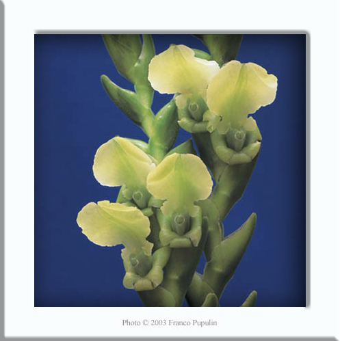 Found in Costa Rica, Panama and Colombia at elevations around 300 to 1000 meters as a medium to large sized, hot to warm growing epiphyte with terete at the base, compressed above stems enveloped in youth by amply loose, appressed sheaths and carrying 2 to 3, approximate, jointed, oblong to elliptic-oblong, coriaceous, bilobed apically, obliquely ascending leaves that blooms in the spring on a terminal, complanate, alate, to 9.2" [to 23 cm] long, to 13 flowered inflorescence subtended by conduplicate sheaths with decurrent keels.