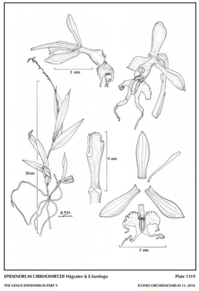 "Epidendrum cirrhohirtzii belongs to the GROUP Pseudepidendrum which is characterized by caespitose plants, cane-like stems, acute to acuminate leaves, usually apical inflorescence, the filiform petals and the lip usually 3-lobed with 3 parallel fleshy keels, the apical lobe often bifurcate, the “bird-wing” type pollinia, and SUBGROUP Paniculatum , which has green and white flowers, often marked with purple on the disc of the lip and apex of the column. The species is recognized by the small, greenish yellow flowers, the lip and apical half of the column white, immaculate, with a single callus, bilobed at the apex. Epidendrum cirrhochilum F.Lehm. & Kraenzl. has a many flowered, paniculate inflorescence, the flowers also green and white, but with a circular purple mark surrounding the disc, and a single, broad callus. Epidendrum cirrhochiloides Hágsater & E.Santiago from Panama has elliptic leaves and larger flowers, sepals .44 to .48" [11 to 12 mm] long, a bicallose lip and similar cirrhose lobes of the lip, which is also marked with purple." Hagsater etal 2010