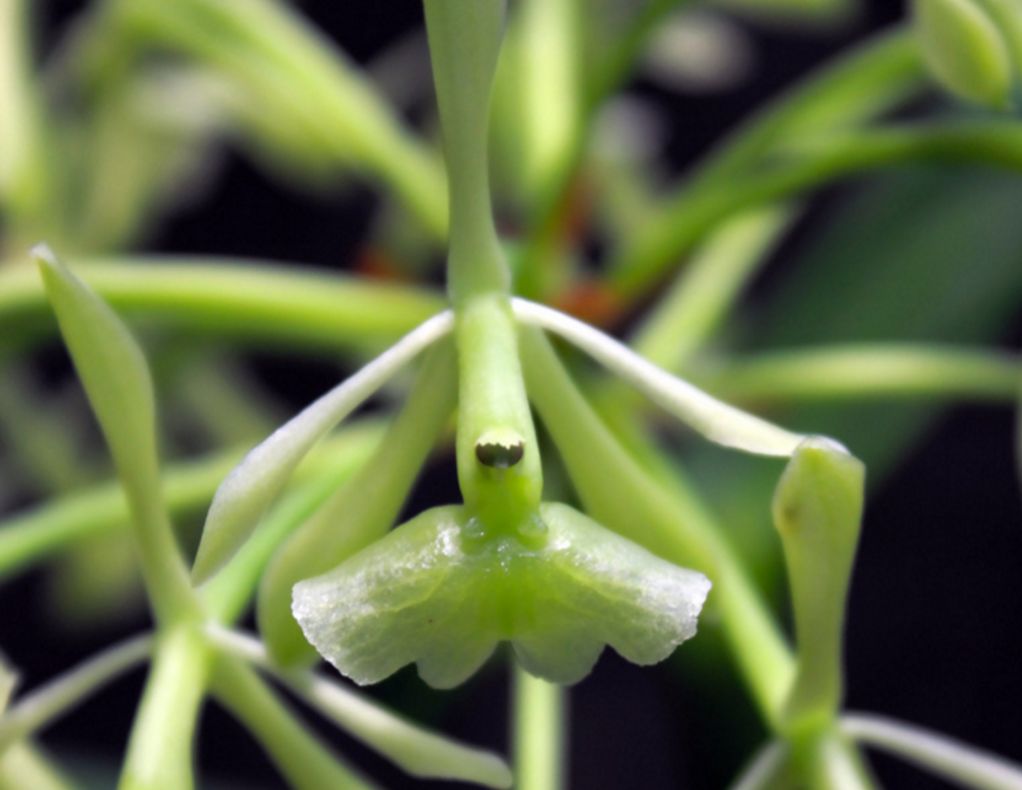 Found on the Pacific coast of southern Mexico in tropical semideciduous and deciduous forests at elevations around 600 to 1300 meters as a small sized, warm to cool growing epiphyte with a simple, terete, slightly flexuous, cane-like stem carrying a few, narrowly elliptic, retuse, coriaceous, conduplicate below into the clasping base leaves that blooms in the winter through spring on a terminal, short, racemose, simultaneously few to several flowered, subcorymbose inflorescence carrying 5 to 20, fragrant [lemon tree], resupinate, bright green flowers.
