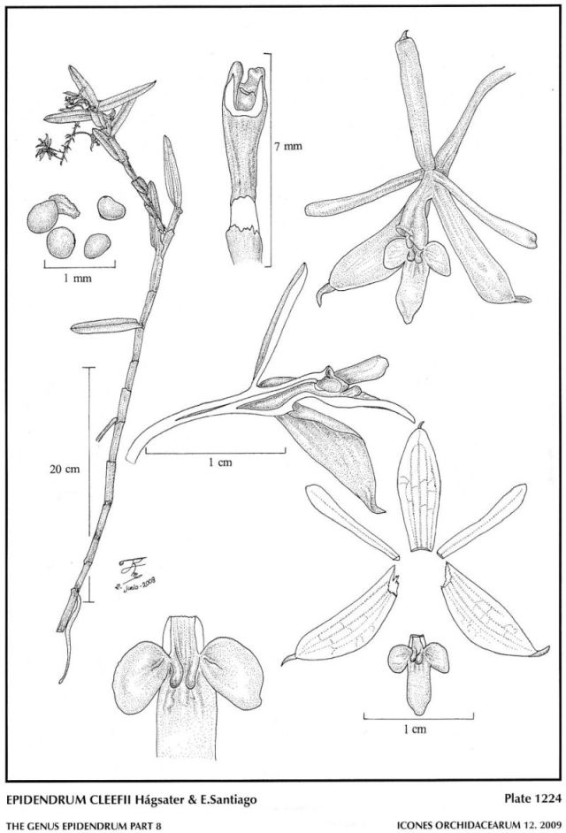 "Epidendrum cleefii belongs to the GROUP Andean SUBGROUP Cernuum, characterized by the long, erect, cane-like stems with sub-apical branching, leaves oblong, sub-coriaceous, with the apex obtuse and the 3-lobed lip and the prominent, funnel-shaped clinandrium. The species is recognized by the oblong-lanceolate leaves, lax-flowered inflorescence with light brown flowers, the sepals prominently awned, and the midlobe narrowly oblong, obtuse. It is very similar to E. cernuum, but that species has a very dense inflorescence with greenish yellow flowers, and the midlobe sub-rectangular, truncate and minutely apiculate. Epidendrum brevicernuum Hágsater has a much shorter inflorescence, green to greenish white flowers, and the midlobe sub-quadrate, nearly as wide as it is long, and emarginate." Hagsater etal 2009