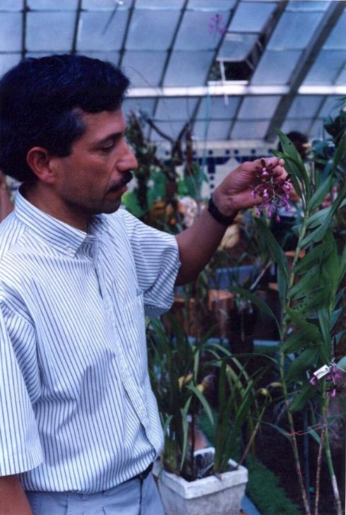 This is an exciting plant! It is the darkest form anybody has ever seen. Bill Goldner now has it and I hope he can self it. The gentleman pictured holding the flower on the plant is Dr. Ernesto Aguirre, one of the foremost Mexican orchid taxonomists in the country. It was taken at an orchid show in Mexico City in 1996.