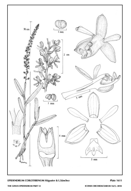 "Epidendrum coilotrienum belongs to the GROUP Mancum which is characterized by the sympodial habit, few-leaved stems, racemose inflorescence with 1 to 2 ancipitose, long, spathaceous bracts with parallel sides, and SUBGROUP Mancum which has nonresupinate flowers, and a generally reduced, fleshy lip. The species is recognized by the laterally compressed stems, shorter narrower leaves 2.4 to 3.68"x .32 to .52" [6.0 to 9.2 x 0.8 to 1.3 cm], elongate, narrowly pyramidal inflorescence, the 3-lobed, ecallose lip with a short, fleshy rib at the base of the mid-lobe, lateral lobes triangular, acute, the apices even with the apex of the sub-rectangular, apiculate mid-lobe. It is very similar to Epidendrum rhombimancum from southern Ecuador and northern Peru (Amazonas), which has longer, wider leaves 3.6 to 4.8" x -96 to 1.2" [9 to 12 x 2.4 to 3.0 cm], conical, densely flowered inflorescence, petals obovate with the margin undulate towards the apex, lip entire, transversely elliptic. Epidendrum mancum Lindl. from southern Ecuador has shorter plants, 6 to 10" [15 to 25 cm] tall, smaller leaves .8 to 2.4" x .52 to 1.08" [2 to 6 x 1.3 to 2.7 cm], conical inflorescence, sepals and petals wider .12 to .2" [3 to 5 mm] wide, and the lip entire. Epidendrum pseudosarcoglottis Hágsater & Dodson has a conical inflorescence, spatulate petals, entire lip claw-like, rectangular with a wide, fleshy callus. Epidendrum sarcoglottis Schltr. from Colombia and Ecuador has a conical inflorescence, larger flowers, sepals and petals .32 to .36" [8 to 9 mm] long, entire, claw-like lip, triangular, the callus forming a wide, fleshy cushion." Hagsater etal 2018