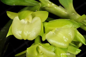 "Epidendrum colombianum belongs to the GROUP Andean SUBGROUP Renilabium which is characterized by the tall plants, monopodial habit, generally large, bilobed leaves, racemose inflorescence, entire to 3-lobed lip with a channel at the base between the calli. The species is recognized by the oblong to oblong-lanceolate leaves up to 8" {20 cm] long, nutant, short inflorescence to 2" [5 cm] long, fleshy, hanging, green to yellow-orange, non-fragrant flowers, partly spreading sepals and petals .56 to .8" {14 to 20 mm] long, reniform lip with a pair of laminar small calli. Epidendrum pazii Hágsater has elliptic leaves up to 3.6" [9 cm] long, fragrant flowers, the lip with a pair of well-separated, parallel, laminar calli. Epidendrum renilabioides Hágsater & Dodson, which is found up to the northern border of Ecuador, has externally purplish brown flowers, petals and lip greenish, the calli and the column white, petals are elliptic-spatulate, the apex obtuse, and the callus of the lip is “Y” shaped, with the lip apiculate, not emarginate." Hagsater etal 2009