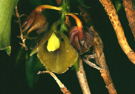 Found in Mexico, El Salvador, Honduras and Nicaragua in wet montane forests at elevations around 1170 meters as a small to just medium sized, warm growing epiphyte with apically leafy, branching stems carrying patent, ovoid-elliptic to oblong-lanceolate leaves that blooms in the spring on a terminal, somewhat descending, short to .8" [2 cm] long, racemose, to 5 flowered inflorescence