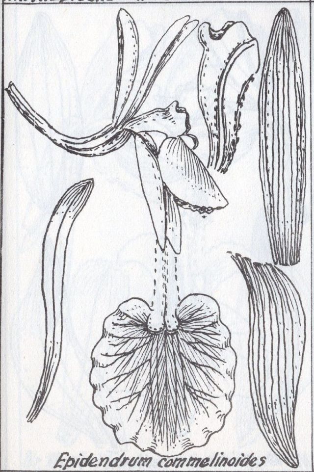 Epidendrum commelinoides is part of GROUP Megalospathum characterized by the caespitose but branching habit, many leafed stem, fleshy, oblique leaves a short few flowered racemose inflorescence subtended by a large semi-ovate spathe carrying a few resupinate flowers with the coulumn obliquely united to the lip, occasionally free. The species is related to E scutella