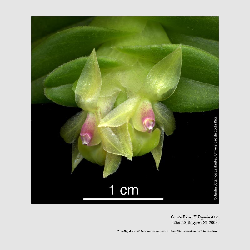 Found in western Costa Rica in seasonally dry forests on oaks at elevations around 1300 to 1750 meters as a mini-miniature [less than 1" long] sized, cool growing epiphtye with an erect to pendant stem enveloped completely by imbricate leaf bearing sheaths and carrying 5 to 11, distichous, spreading, amplexicaul, succulent, ovate to ovate-oblong, rounded, slightly bilobed apically leaves that blooms in the fall through spring on a terminal, sessile, few flowered, occurring only once inflorescence with shorter than the ovaries, obovate, oblique, rounded, conduplicate floral bracts and 2 to 3 simultaneously opening flowers.