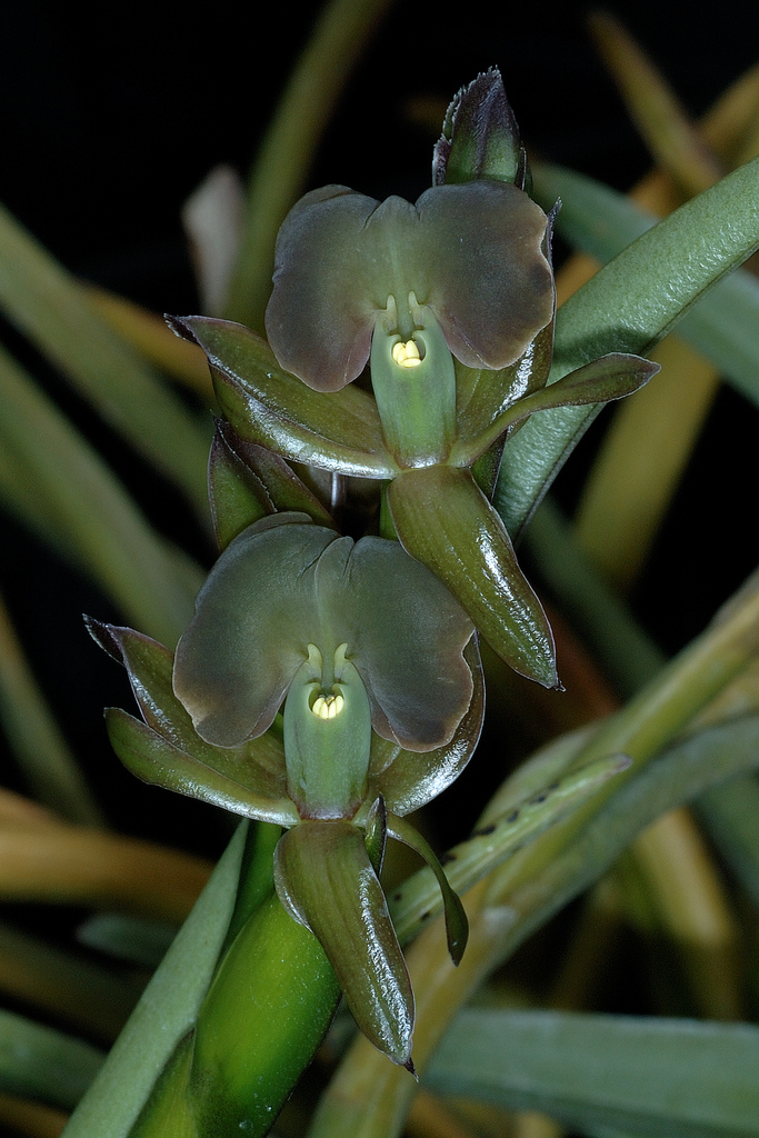 Occuring in Costa Rica and Panama in wet subtropical montane forests at elevations of 350 to 1800 meters as a medium sized, reedstem, hot to cool growing epiphyte or terrestrial on steep slopes with a creeping rhizome, compressed, gradually increasing in size stems completely concealed by distichous, imbricating sheaths carrying a single ligulate, obliquely bilobed, conduplicate below into the base leaf that is bright green on top and purple below with a terminal, erect, to 10" [25 cm] long, fractiflex, racemose, that has few to many, fragrant [not nice] flowered inflorescence arising on a newly maturing pseudobulb with imbricating brown basal bracts and large, purple floral bracts occurring in the winter.