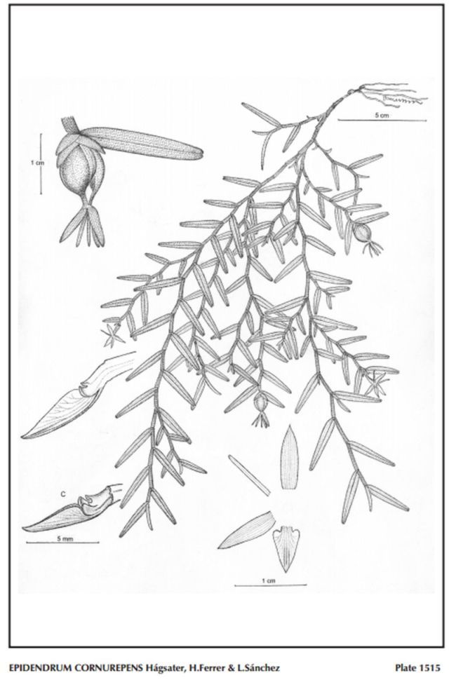 "Epidendrum cornurepens belongs to the GROUP Ramosum which is characterized by the monopodial, branching stems, the spike-like, distichous inflorescence, and the single callus, and the SUBGROUP Repens, which has strictly pendent plants, with small leaves less than 1.36" [3.4 cm] long. The species has long plants, up to 24" [60 cm] long, with an evident primary and secondary stems, and short flowering branches; leaves on the primary and secondary stem are .8 to 1.36" [2.0 to 3.4 cm] long, while those of the flowering branches are .4 to .76" [1.0 to 1.9 cm] long, inflorescence has a single flower, sepals .32 to .36" [8 to 9 mm] long, lip .24 to .26" [6.0 to 6.5 mm] long, triangular narrowly cordate, apex acute, and the column has a pair of falcate, prominent apical wings. It is very similar in vegetative structure and flowers to Epidendrum repens Cogn. which is widely distributed from Mexico to northern Venezuela and the Lesser Antilles, and has smaller leaves and flowers, leaves to !" [2.5 cm] long, sepals .24 to .288" [6.0 to 7.2 mm] long, the lip .12 to .132" [3.0 to 3.3 mm] long, and lacks the evident apical, falcate wings at the apex of the column. Epidendrum brachyrepens Hágsater, endemic to middle Central America and the Larger Antilles, has short stems, no primary stem, leaves are all small and similar, .24 to .48" [6 to 12 mm] long, ovary is arched at the apex, sepals are .3 to .32" [7.5 to 8 mm] long, lip .152 to .2" [3.8 to 5.0 mm] long, and the column lacks any evident wings. Epidendrum strobiliferum Rchb.f., widely distributed throughout the neotropics, has much shorter plants, 8 to 12" [20 to 30 cm] long, smaller flowers, 3 to 5 per inflorescence, sepals -136 to .172" [3.4 to 4.3 mm] long, and the lip has a “Y” shaped callus. Epidendrum luckei Bock is endemic to the lowlands of the Darien and Chocó regions of Panama and Colombia with an inflorescence carrying 3 to 5 flowers, with a tridentate callus on the lip and the anther terminates in a pair of elongate horns." Hagsater etal 2015