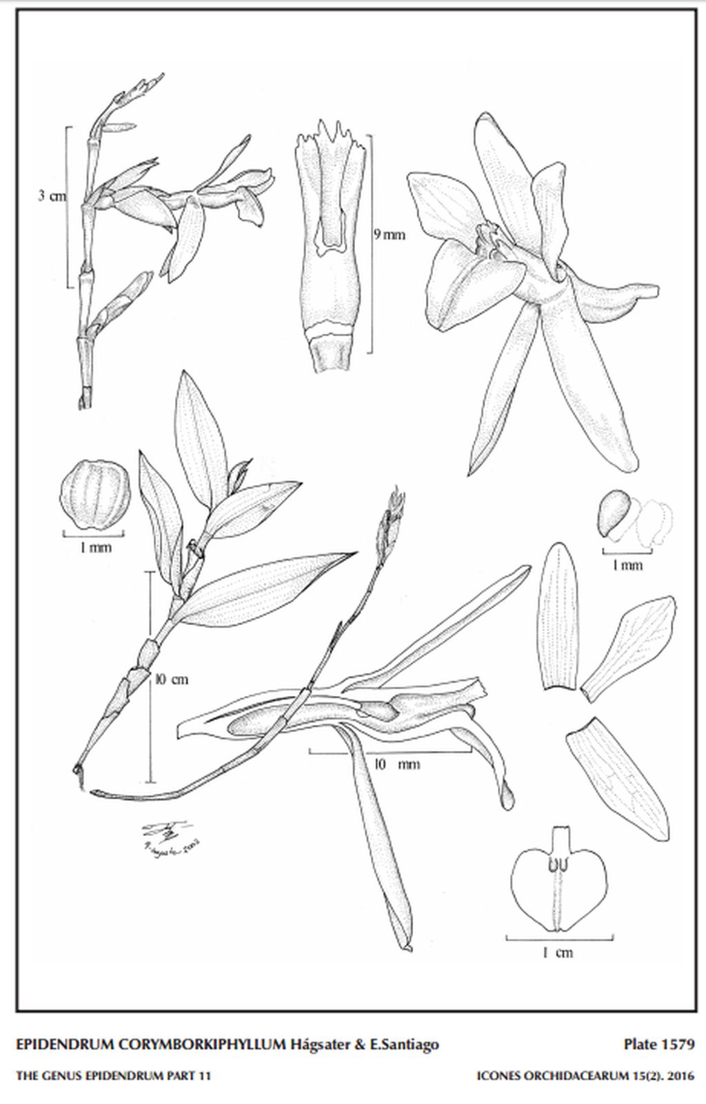 "Epidendrum corymborkiphyllum belongs to the GROUP Alberti which is characterized by the sympodial habit, laterally compressed to ancipitose or somewhat fusiform-thickened stems, inflorescence apical or apical and lateral racemose, with distichous, more or less imbricating bracts on peduncle, producing one flower at a time, and the SUBGROUP Allenii which is characterized by stems with numerous leaves, apical inflorescence (rarely lateral), peduncle elongate, bare, non-bract bearing, two-winged, rachis short, covered by rounded, usually imbricating, bracts. The species is recognized by the creamy yellow flowers, apex tinged pink, sepals oblong apex rounded, .54 to .56" [13.5 to 14 mm] long, petals obtrullate, margin entire, lip cordiform with a pair of small sub-spherical calli. Epidendrum tropidioides Garay has green flowers, sepals narrowly lanceolate, apex acute, .88 to 1,04" [22 to 26 mm] long, petals narrowly rhombic, margin erose, lip obovate, base cuneate, with a pair of prominent, laminar calli. Epidendrum lagenomorphum Hágsater & Dodson has green flowers, sepals .5 to .516" [12.5 to 12.9 mm] long, petals narrowly oblanceolate, lip sub-orbicular, base cuneate. Epidendrum adnatum Ames & C.Schweinf. has green flowers, sepals hyaline, tinged with purple, sepals .36 to .48" [9 to 12 mm] long, oblanceolate, apex acute, petals linear-filiform, lip ovate, apex acute, and a pair of prominent calli. Epidendrum gentry Dodson shares the size of the flowers, obtrullate petals, and the prominent clinandrium-hood, but the lip is wide-ovate somewhat rhombic, base cuneate, and that species has the stems somewhat fusiform-thickened in the middle, and leaves distributed only along the apical half of the stem." Hagsater etal 2016
