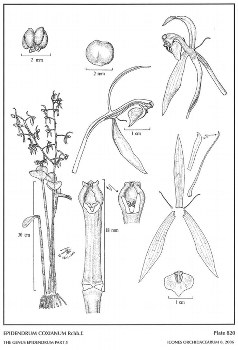 "Epidendrum coxianum is very distinct, and cannot be confused with any other species in the neotropics. It belongs to the GROUP Excisum SUBGROUP Leucochilum characterized by the caespitose habit, erect stems with several fleshy leaves, a spathaceous bract, and the inflorescence with numerous star-like flowers, with narrow sepals and petals and a prominent lip. The species is recognized by the tall, terete, cane-like stems, with a pair of elliptic-orbicular, coriaceous leaves, an erect, lax-flowered, racemose to paniculate inflorescence with large, simultaneous flowers, the petals much reduced, hair-like, and a suborbicular lip at the end of an upright, sigmoid column; the lonely spathaceous bract is small. The species nearest to it is Epidendrum lehmannii Rchb.f., from the eastern slopes of the Andes in southern Ecuador where they are sxmpatric and northern Peru, which has the stems laterally flattened above, 2 to 5 leaves distributed towards the apical 1/3 of the stems, the leaves elliptic, .56 to 1.04" [14 to 26 cm] long, a prominent spathaceous bract.28 to .68" [7 to 17 cm] long, and the flowers star-like, the sepals and petals similar, and the lip 3-lobed, with a narrow, triangular midlobe." Hagsater etal 2006