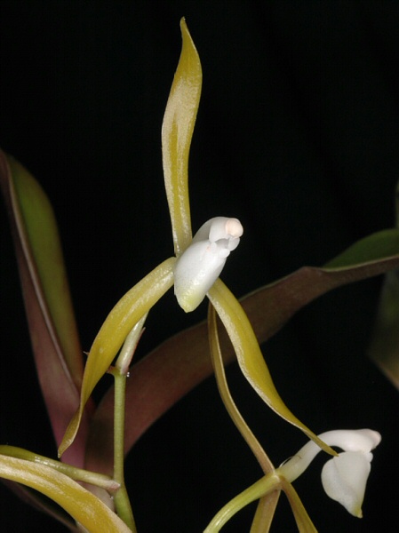 Found in southern Ecuador on the eastern slopes of the Andes in wet montane forests at elevations of 1200 to 2600 meters as a small sized, cool to cold growing epiphyte with erect, slender, cane-like stems enveloped by scarious sheaths and carrying two apical, elliptic, coriaceous, apically obtuse, basally acute leaves and blooms in the winter on a terminal, 8" [20 cm] long, 4 to 6 flowered, racemose inflorescence enveloped basally by a single, expanded, scarious sheath with the simultaneously opening flowers subtended by a triangular bract.