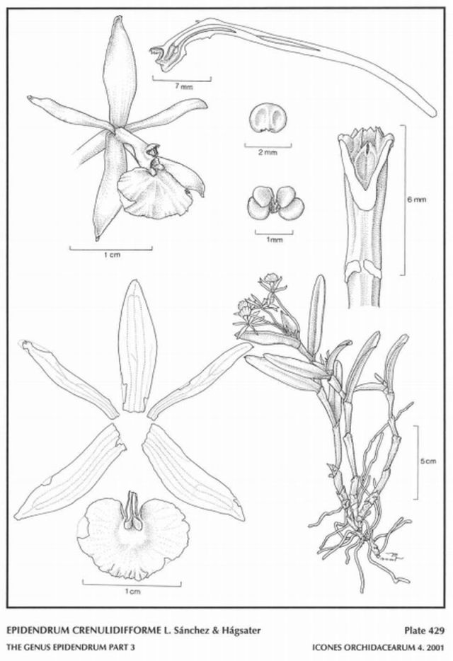 "Epidendrum crenulidifforme belongs to the GROUP Difforme characterized by the caespitose, sympodial plants, fleshy, pale green to glaucous leaves, apical inflorescence, sessile, rarely with a short peduncle, one-flowered to many-flowered, and then corymbose, without spathaceous bracts, fleshy, green to yellowish-green rarely white flowers. The species can be recognized by the terete stems, 3 to 4 flowers, narrowly elliptic-oblong petals, entire lip with crenulate margin, prominent clinandrium. It is similar to E. floridense Hágsater from Florida and widespread in Cuba and Haiti, which has larger plants with many flowers, oblanceolate petals, cordate lip with the margin entire. Other species from the Caribbean Islands include Epidendrum caribiorum widespread from southeastern Cuba to Trinidad and Tobago has large, vigorous plants, laterally compressed stems, narrowly obovate petals and three lobed lip. Epidendrum orientale Hágsater & M.A. Díaz from south-eastern Cuba and Jamaica has short compact plants, bilobed lip with the lobes subovate and sometimes notched at the margin, giving the impression of a 4-lobed lip, and wide, divergent calli. Epidendrum boricuarum Hágsater & L. Sánchez from Cordillera Central of Puerto Rico and the Dominican Republic, has larger plants, laterally compressed stems, three-lobed, emarginate lip with small drops of nectar, and an arcuate column. Epidendrum difforme Jacq., widespread in the lesser Antilles, has strongly laterally compressed, ancipitose stems, and a 3-lobed lip." Hagsater etal 2001