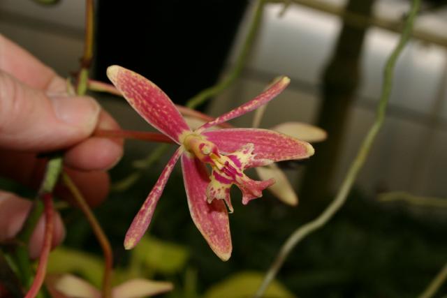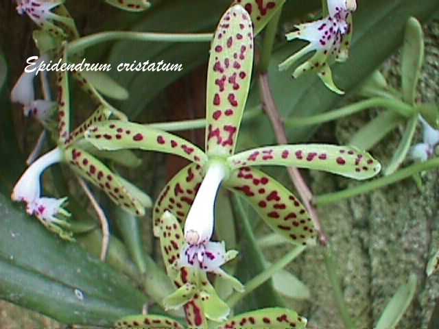 "Epidendrum cristatum belongs to the GROUP Cristatum which is characterized by the sympodial, caespitose habit, many-leaved stems, apical racemose inflorescence wlth several large, imbricating bracts, and producing successive racemes over the years from the peduncle, and the SUBGROUP Cristatum, with generally greenish flowers, the lip with the margin of lateral lobes generally fimbriate-laciniate. The species is recognized by the tall plants, to 96" [2.4 meters] high, the narrowly elliptic-lanceolate leaves, long, nutant, racemose inflorescence 10 to 16" [25 to 40 cm], the sepals and petals yellow to pale green with reddish spots, the apex of the column and the lip white and pale green, occasionally somewhat tinged pink, the 3-lobed lip with the apical margin of the lateral lobes erose to erose-laciniate, the midlobe obcuneate with the apex bilobed the lobes rectangular, divaricate, with the apical margin slightly dentate. Epidendrum criniferum Rchb.f. has shorter plants, fewer flowers, the margins of the lateral lobes of the 3-lobed lip are deeply fimbriate-laciniate, and the linear midlobe occasionally with a pair of retrorse cilia at the apex." Hagsater etal 2008