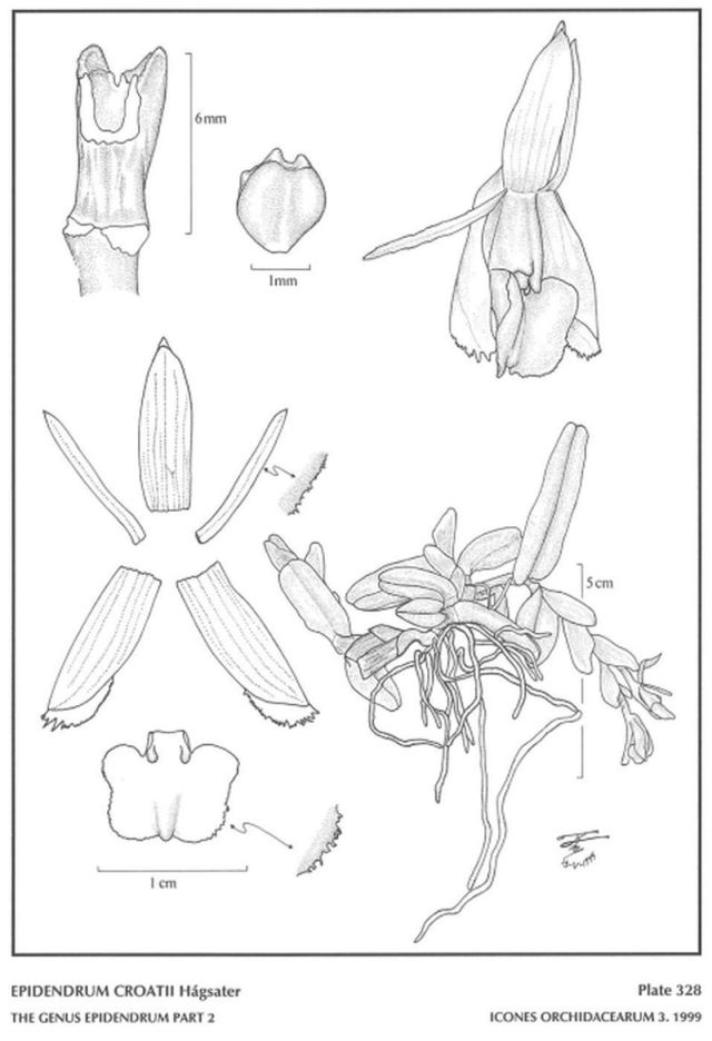 "Epidendrum croatii GROUP Spathiger SUBGROUP Coriifolium characterized by the sympodial habit, coriaceous leaves, and the racemose, distichous inflorescence carrying fleshy green to purplish flowers. The species is closely related to Epidendrum coriifolium, E. croatii is the smallest species of the group, and can be recognized by the floral bracts which are rounded, rounded, short, not imbricating, the dentate keels of the sepals and margin of the lip and petals are unique to this group. Epidendrum summerhayesii Hágsater also has rounded bracts, but these are imbricating and plants are large and deep green with maroon tinge, the successive, numerous flowers usually purple. Epidendrum coriifolium is found in Mexico and Guatemala, and has compact plants, the inflorescence about as long as the apical leaf, and flowers are simultaneous. Epidendrum caluerorum Hágsater has long, narrow leaves and acute, subparallel bracts about as long as the ovary, on a long peduncle." Hagsater etal 1999