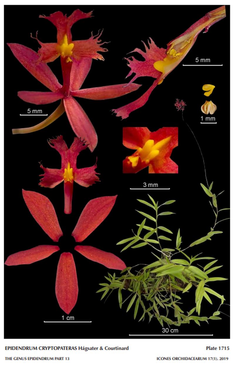 "Epidendrum cryptopateras belongs to the GROUP Secundum SUBGROUP Secundum which is characterized by the caespitose habit, erect, simple, cane-like stems, a normally elongate peduncle of the inflorescence, an erect raceme of generally resupinate, showy, colorful flowers, and a lip adorned by two calli and a median narrow keel. The new species is recognized by the terrestrial habit, bright red non-resupinate flowers with the anther, apical lobes of the column, calli and mid-rib of the lip yellow, petals oblong-elliptic, obtuse, lip deeply 3-lobed, base somewhat cordate; lateral lobes sub-quadrate, mid-lobe formed by a narrow isthmus in the basal half, apical half bilobed the lobes divergent, sub-quadrate, the distal margin dentate-laciniate, with a mucro in the apical sinus. At first sight it appears to be the XIX century hybrid Epidendrum × obrienianum Rolfe being the same color, and overall shape, but that hybrid has wider sepals and petals, the apex of the column has elongated digitiform lateral lobes, and the calli are wider, not digitiform. Epidendrum puniceoluteum F.Pinheiro & F.Barros, from the southern coast of Brazil, is also very similar, but has wider sepals and petals, shorter apical lobes of a thicker and wider column and wider, sub-quadrate calli, and a wider mid-rib. Epidendrum × elongatum Jacq. is the natural hybrid between the new species and Epidendrum secundum Jacq. and produces all the intermediate shapes and colors from pink with a large white callus to red with yellow calli and mid-rib. Epidendrum revertianum (Stehlé) Hágsater, also native to Martinique, has resupinate, white flowers with pale yellow calli and the lip orbicular in general outline, composed of four sub-equal lobes, the laterals more or less at a 45° angle. Epidendrum cyparisii Hágsater, Charly & Viscardi, also from Martinique, has resupinate flowers white, with apex of the column, anther, and disc of the lip purple tinged, calli and mid-rib white, petals elliptic-rhombic, obtuse, lip deeply 3-lobed, base deeply cordate; lateral lobes oblique, rhombic, mid-lobe formed by a narrow isthmus in the basal half, apical half obliquely rhombic in outline, bilobed, the lobes divergent, sub-quadrate" Hagsater etal 2019