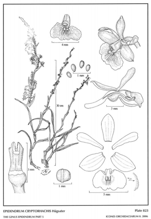 "Epidendrum cryptorhachis belongs to the GROUP Epidendropsis SUBGROUP Gracillimum characterized by the sympodial, caespitose, relatively small plants with non-thickened stems, long, paniculate inflorescence delicate, small flowers, and the long, narrow, subcoriaceous leaves. The species is recognized by the short plants with a long inflorescence, about twice as long as the apical leaf or more, appearing at first sight racemose, with an erect, laterally compressed rachis, prominent bracts, but under closer inspection, paniculate, with short, strict, parallel, 4 to 14 flowered racemes appearing from each of the upper bracts, ovary short, .2 to .24" [5 to 6 mm] long, the petals narrowly spatulate, .148 x .04" [3.7 x 1 mm], and a wide, reniform, 3-lobed lip, deeply cordate, the midlobe formed by two small, rounded lobes with a wide apicule in the sinus. It is similar to Epidendrum gracillimum but that species has narrower leaves, a long narrow nectary penetrating about half the ovary, linear petals, and an entire, reniform lip. Epidendrum physophorum Schltr. from Bolivia has a much shorter inflorescence, the branches widespread, flowers smaller, a short, inflated nectary, a comparatively slender column, sepals .121" [3.25 mm] long, petals linear, and the reniform, entire lip with a dentate-erose margin." Hagsater etal 2006