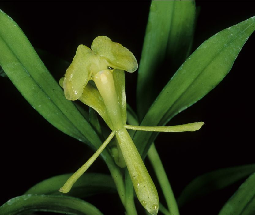 Found in Colombia and Ecuador along the eastern slope of the Andes and the Cordillera del Condor in wet mossy forests in well ventilated spots at elevations of 1000 to 2000 meters as a small sized, cool growing epiphyte with cane-like, laterally compressed stems carrying 5 to 8, all along the stem, unequal, progressively larger above, obliquely lanceolate, acute, green leaves that blooms at any time of the year on a terminal, arising through a single, long, narrow, acuminate spathe occuring only once, racemose, arising on a mature stem, peduncle .4 to .6" [1 to 1.5 cm] long, terete, rachis successively single, 1 to 3 flowered inflorescence with similar to the spathe but shorter, long, acuminate floral bracts and carrying non-resupinate, pale green turning yellowish with age, non fragrant flowers.