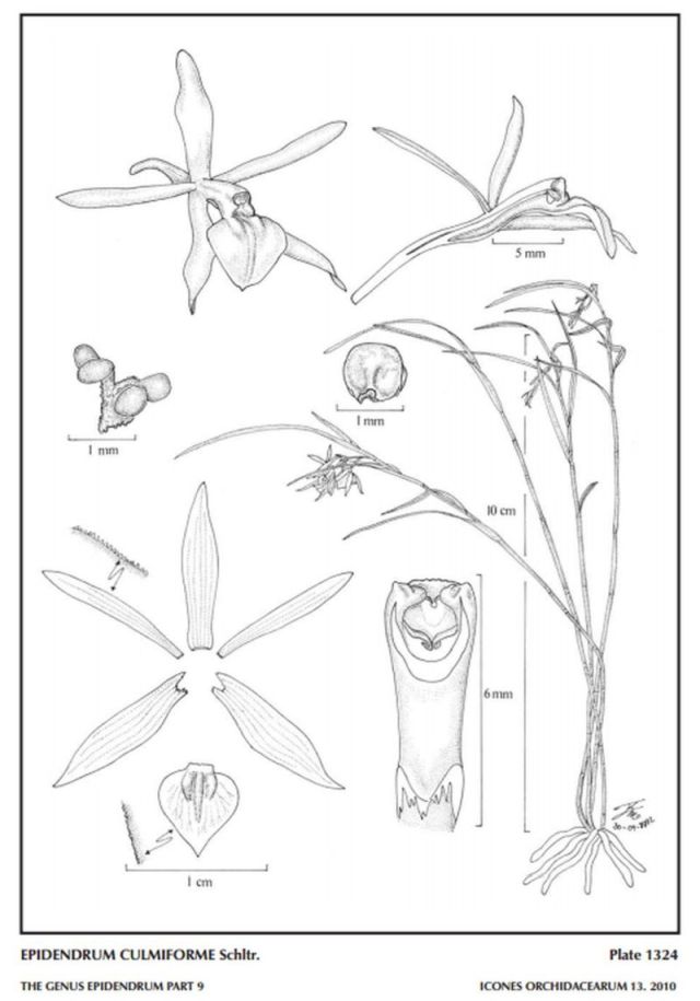 "NOTE: Many authors have considered E. culmiforme as a synonym of Epidendrum chloe Rchb.f., but we have found conspicuous differences in all the specimens, so we consider them as distinct species with different distribution ranges, flowering times and clear differences in the shape of the lip." Hagsater etal 2010