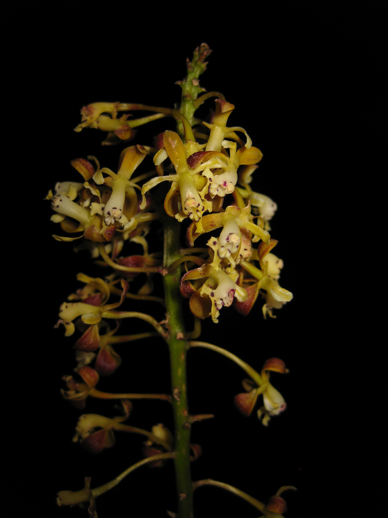 Found in Colombia, Ecuador and Peru in seasonally dry, montane cloud forests at elevations around 2000 to 3200 meters as a medium sized, cold growing epiphyte with a creeping rhizome, giving rise to erect, cane-like, branching stems enveloped by flattened, vaginate sheaths and carrying 1 to 2 per branch, apical, lanceolate to lanceolate-oblong, acute, clasping at the rounded base, erect-spreading leaves that blooms in the spring to summer on a terminal, erect, 13.6" [34 cm] long, rather dense, many flowered, inflorescence mostly enveloped by 2 to 3, close, equitant, imbricating, elongate spathes.