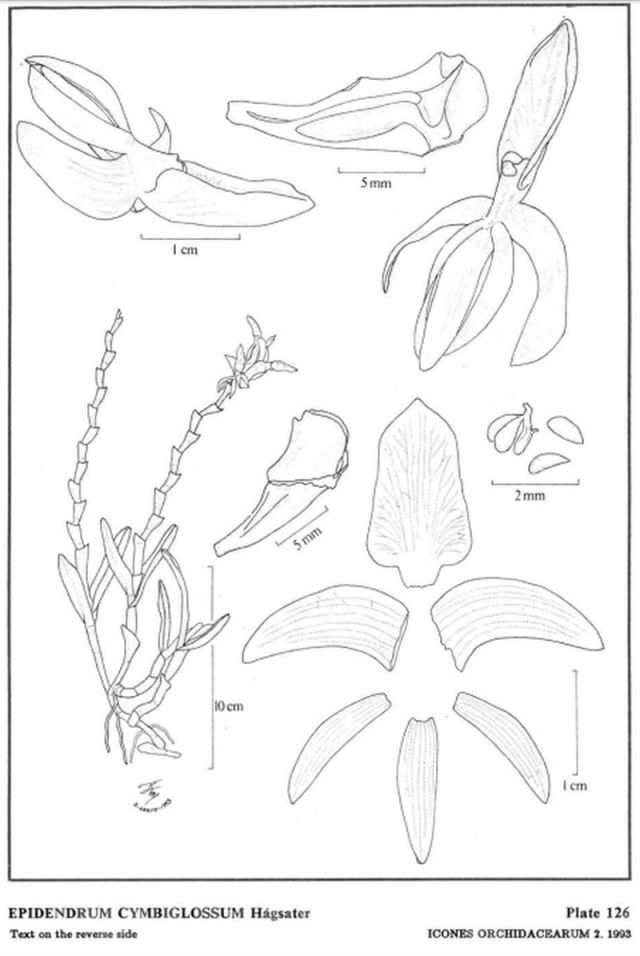 "Epidendrum cymbiglossum belongs to the GROUP Neowilliamsia characterized by the ancipitous stems and rachis with conduplicate, acute bracts and usually non-resupinate flowers with an often digitate lip and has 2 pollina with 2, hard, laminar caudicles. The species is recognizable by the ancipitous rachis, conduplicate, acute bracts, and laminar, lorate caudicles with either 2 or 4 pollinia. Epidendrum cymbiglossum closely resembles E. anoglossum Schltr. at first sight, but can be easily distinguished by the stout, two-leaved stems; successive, larger flowers with the lip .68" [17 mm] long vs. .28 [7 mm long], and the distinctly formed long-trapezoid, obtuse vs. trullate, acute lip." Hagsater etal 1993