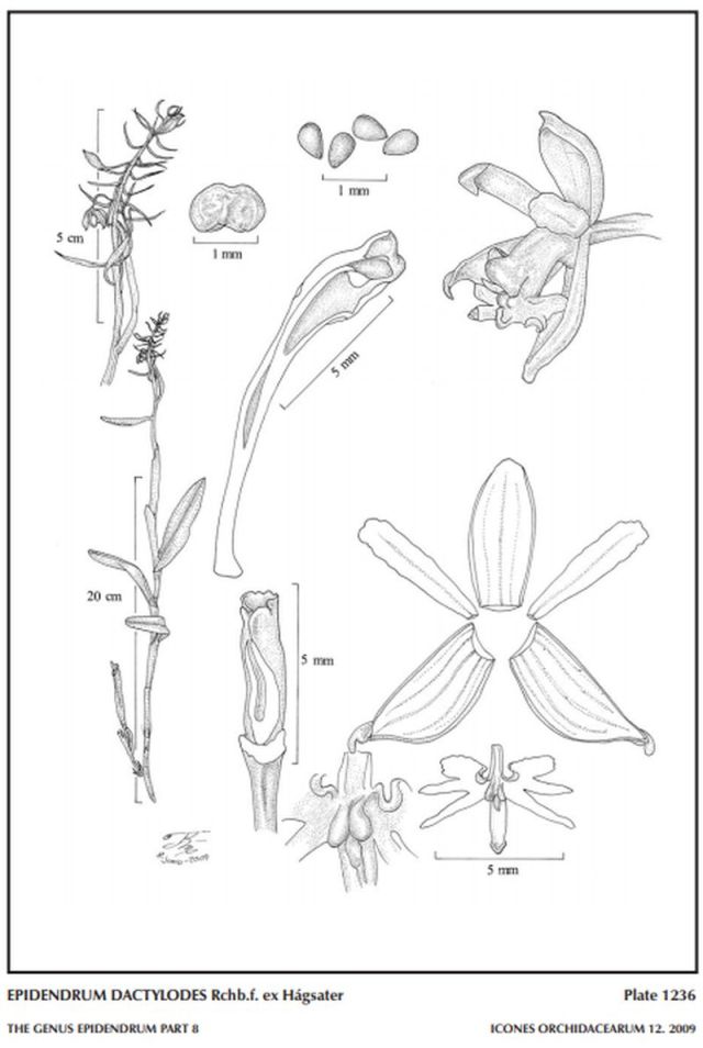 "Epidendrum dactylodes belongs to the GROUP Brevivenium which is characterized by the repent rhizomes with erect, thin, few-leaved stems, and a pair of conduplicate tubular spathaceous bracts at the apex; the inflorescence is erect, with prominent floral bracts; the lip appears 7-lobed. The species is recognized by the 3, lanceolate-elliptic leaves 1.6 to 2.6" [4 to 6.5 cm] long; small flowers, sepals .24 to .28" [6 to 7 mm] long, the lateral sepals with a prominent apical awn, petals truncate at the apex, lateral lobes of the lip finger-like, and the midlobe oblong-ensiform, the margin entire and slightly involute at the apex. The better known Epidendrum brevivenium Lind. is apparently endemic to Ecuador, has more numerous, wider, elliptic leaves, a shorter inflorescence, petals obtuse at the apex, and the midlobe of the lip which expands near the apex into two divergent lobes. Epidendrum guanacasense Hágsater & Dodson has up to 18, ovate, leaves on the stem, .4 to .8" [1 to 2 cm] long; sepals .16" [4.5 mm] long, the lateral lobes of the lip do not form finger-like lobes, and the midlobe is oblong-rectangular, simple, with a sub-entire margin." Hagsater etal 2010