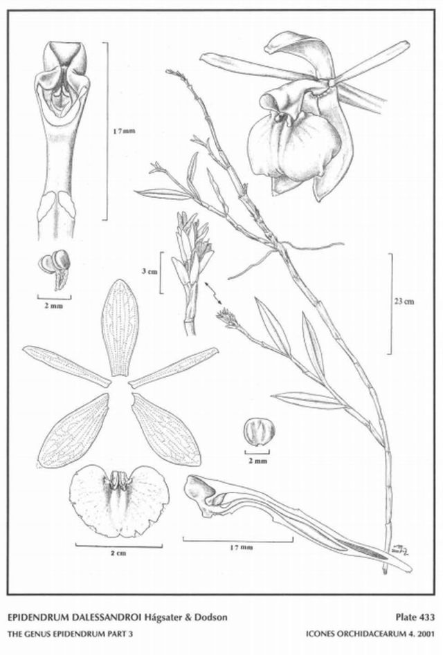 "Epidendrum dalessandroi belongs to the GROUP Alberti SUBBGROUP Alberti characterized by the caespitose habit, with numerous green to purple colored leaves, the laterally flattened stems with apical, and lateral inflorescence, the apical one with an anciptitose peduncle terminating in a conduplicate, spathaceous bract somewhat larger but similar to the floral bracts, and one to several racemes of imbricating, conduplicate, rounded, bracts which produce flowers one at a time. The species is recognized by the long plants with apical and lateral inflorescences, the ancipitose cane-like stems, the long, ancipitose peduncle of the inflorescence covered partially by rounded conduplicate bracts, and the large flowers with a convex, cordiform, emarginate lip, dorsal sepal cucullate, the column prolonged by the long, entire clinandrium. Epidendrum phyllocharis Rchb.f. has somewhat flattened stems, bilobed leaves, and smaller flowers, the dorsal sepal spreading, erect, lip 5-angled." Hagsater etal 2001