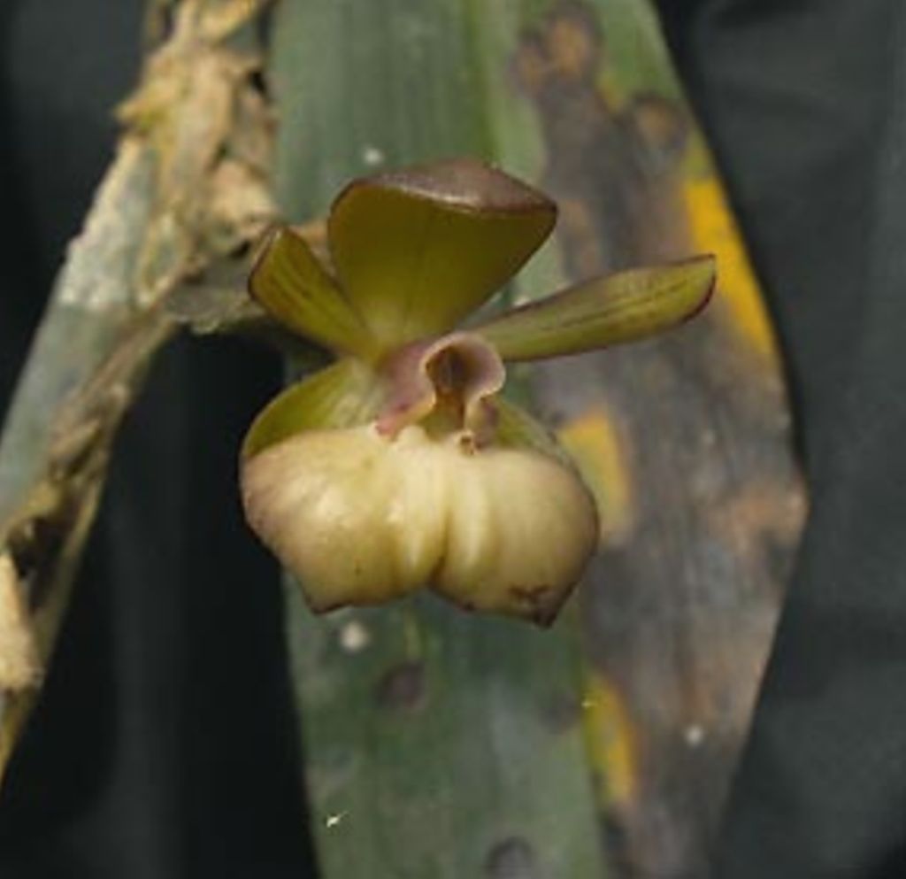 Found in southern Ecuador in wet bogs of cloud forests at elevations around 2100 to 2800 meters as a giant sized, cold growing epiphyte with branching, cane-like, terete in the basal portion, ancipitous above stems carrying numerous, distributed all along the stem, narrowly elliptic, acuminate apically leaves that blooms in the winter on a terminal and or lateral, compound-racemose [produces new racemes from the bracts of the original peduncle with time], 5 to 8" [12.5 to 20 cm] long including the 3.6 to 4.4" [9 to 11 cm] long, elongate, ancipitose peduncle with prominent bracts, successively single, to 15 flowered inflorescence without a spathe and carrying longer than the ovary, oblong-elliptic, obtuse to rounded, conduplicate, imbricate floral bracts.