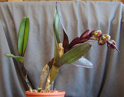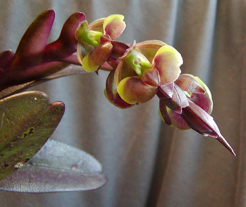 Found in Costa Rica and Panama in cloud forests at elevations of 1100 to 2100 meters as a medium sized, cool to cold growing epiphyte with cane-like, laterally compressed, ancipitous stems carrying 2 to 3 [4], coriaceous, strap-shaped, bilobed apically, green with purple margin leaves that blooms in the spring through fall, on a terminal, erect, ocurring only once, racemose, distichous, to 16" [40 cm] long, zigzag rachis, laterally compressed, ancipitous, to 20 flowered inflorescence with longer than the ovaries, conduplicate, apically rounded to bilobed, spaced apart, divergent, green, densely dotted reddish-purple floral bracts and carrying successively few at a time, non-fragrant flowers.