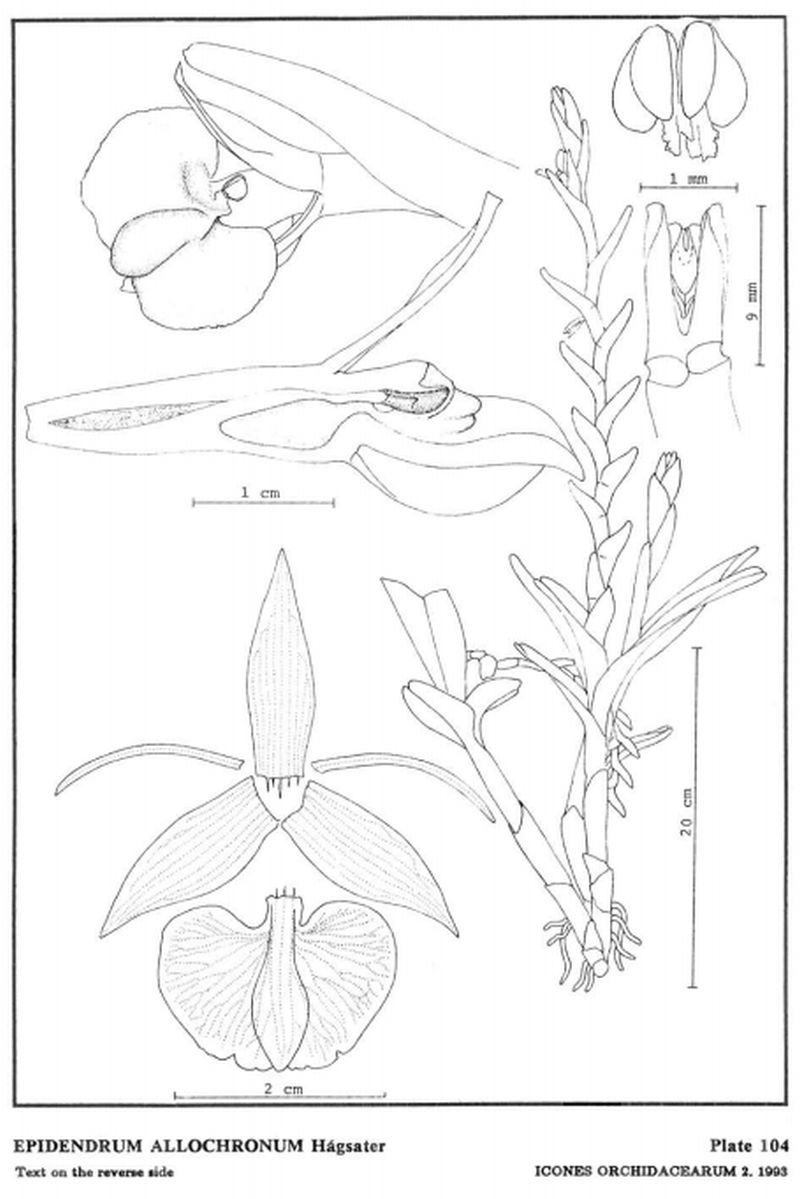 "Epidendrum allochronum belongs to the GROUP Spathiger SUBGROUP Coriifolium characterized by the sympodial habit, coriaceous leaves, and the racemose, distichous inflorescence carrying fleshy green to purplish flowers The species can be distinguished by the stems with 2 to 3 (4) coriaceous, strap-like leaves, inflorescence much longer than the uppermost leaf, divergent, long floral bracts narrowly rounded at the apex and finely and abundantly dotted with reddish-purple, successive flowers produced one at a time, and single veined petals appressed to the lateral sepals. Epidendrum coriifolium, from Guatemala and Mexico, has shorter, compact plants, the inflorescence about as long as the apical leaí and simultaneous flowers; E. caluerorum Hágsater has narrow leaves, bracts subequal to the ovary in length, and the lip with two distinct calli; Epidendrum magnibracteatum Ames 1922 has acute bracts and many flowers open at the same time; E. summerhayesii Hágsater has widely rounded, imbricating bracts; and E . behariorum Hágsater has elongate inflorescence with 3 to 5 flowers open at the same time and spreading, truncate bracts." Hagsater etal 1993