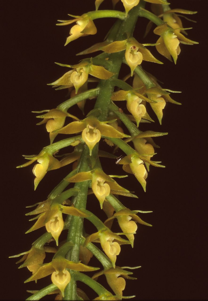 Found in Ecuador, Peru, Brazil and Bolivia in wet montane forests at elevations of 450 to 1600 meters as a small sized, warm to cool growing epiphyte on tree trunks with slender, erect stems that are leafy towards the apex and basally enveloped by tubular, scarious leaf sheaths and carrying ascending, narrowly lanceolate, basally clasping, acuminate, thin leaves and blooms in the fall and winter on a densely flowered, terminal, racemose inflorescence arising on mature canes with numerous small flowers.