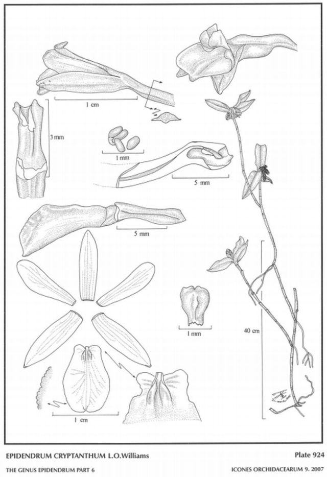 "Epidendrum cryptanthum belongs to the GROUP Polychlamys SUBGROUP Polychlamys which is characterized by the successive lateral growths, the distichous, apical inflorescence with prominent, conduplicate, acute, glumaceous floral bracts. The species is distinguished by the short, compact, paniculate inflorescence, composed of 1 to 3 racemes, a feature which is not evident from the compact inflorescence, especially in pressed specimens, flowers creamy white totaly hidden within the imbricating glumaceous bracts, sepals free, .36 to .46" [9 to 11.5 mm] long, lip obovate-pandurate with the lateral margins involute, and the thin ovary not inflated. It has been confused with Epidendrum salpiclamys Hágsater & E.Santiago which has narrower leaves less than .68" [17 mm] wide, a simple, sessile, compact, racemose inflorescence, imbricating floral bracts, the trumpet- shaped, greenish yellow flowers, with the sepals basally connate and abruptly reflexed above the middle, the oblong lip and the thin, non-inflated ovary. Epidendrum estrellense Ames has an elongate inflorescence 2" [5 cm] long with 7 imbricating bracts covering the peduncle, greenish yellow to green flowers of similar size with the sepals .4" [10 mm] long, the lip is suborbicular-cordate, conduplicate in natural position, and the ovary does not form a vesicle." Hagsater etal 2007