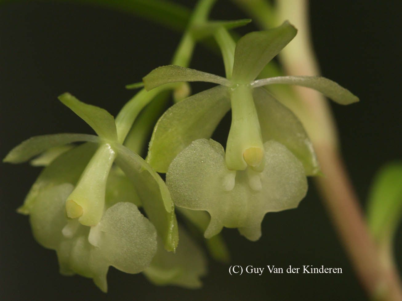 Found in northern Venezuela in the surrounding forests of Caracas at elevations of 1800 to 2200 meters as a small sized, cool to cold growing epiphyte with a branching, arising from the subapical node of the previous stem carrying 2 to 3, towards the apex, elliptic-oblong, acute leaves that blooms in the summer and early fall on a terminal, arching, racemose, laterally compressed, corymbose, .8 to 2" [2 to 5 cm] long, 2-12 green flowered inflorescence arising on a mature stem with triangular, acuminate, shorter than the ovary floral bracts and carrying simultaneously opening flowers.
