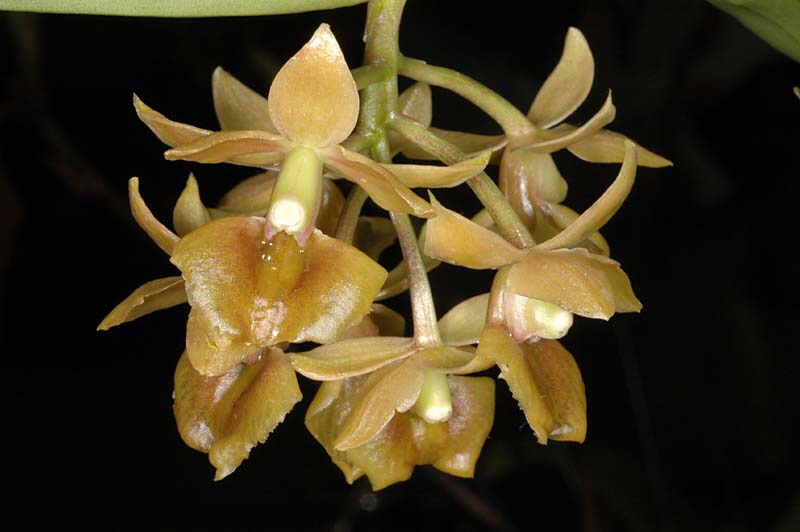 Found in southwestern Colombia on the eastern slope of the Cordillera Central and northwestern Ecuador on the upper western slope of the Andes on roadbanks and cliffs in cloud forests and among bushes and weeds below at elevations of 1500 to 3150 meters as a medium sized, cold growing epiphyte, lithophyte or terrestrial with a branching above, cane-like, terete stem enveloped by tubular leafless sheaths and carrying numerous, almost all along the stem, coriaceous, alternate, narrowly lanceolate to linear, obtuse, unequally bilobed, basally clasping, margin entire leaves that blooms in the fall through spring on a terminal, held close to the apex, racemose, arching, simultaneously 7 to 14 flowered inflorescence with much shorter than the ovary, deltoid, acuminate floral bracts and carrying clusters of a few to several, disagreeably scented, brown to reddish brown, rarely greenish brown flowers sometimes with a white column.