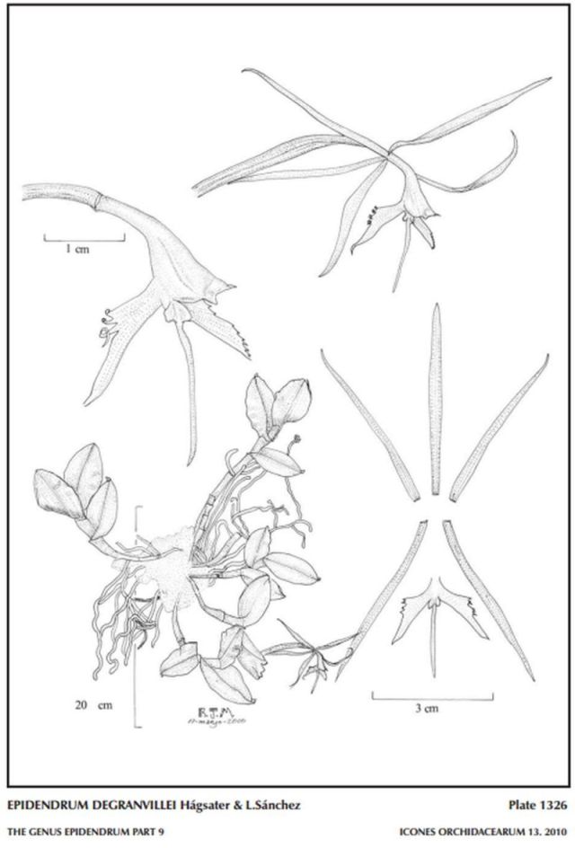 "Epidendrum degranvillei belongs to the GROUP Nocturnum which is characterized by the sympodial, caespitose plants, short, racemose or pluri-racemose inflorescence, without spathaceous bracts, usually large, star-shaped flowers, with similar sepals and petals, and the SUBGROUP Nocturnum which has cane-like stems, non-thickened towards the middle, and usually successive flowers; the flowers are mostly indistinguishable in shape. The species can be recognized by short plants, ancipitose stems, with 2 to 3 elliptic to ovate-elliptic leaves, length/width: 2:1; ovary twice as long as the sepals which are .192 to .196" [48-49 mm] long, sepals and petals red-brown, the lateral lobes of the lip narrowly semi-rhombic, the outer margin irregularly dentate beyond the middle, the rest entire, the column with an acute, triangular tooth on each side, and the clinandrium-hood with a prominent, sub-erect, triangular, acute extension in the middle. It is similar to Epidendrum anchinocturnum Hágsater, a species endemic to the Valle del Cauca in Colombia, but the flowers of that species are smaller, sepals 1.04 to 1.16" [26 to 29 mm] long, the margins of the lip all entire, column short, .52" [13 mm], without lateral teeth, and the clinandrium-hood is dentate. Other species of this group with a similar leaf length/width ratio have taller plants, longer ovaries and larger flowers, the margins of the lip entire and the clinandrium-hood erose to dentate, they include Epidendrum angustilobum Fawc. & Rendle (syn. Epidendrum latifolium (Lindl.) Garay & Sweet), Epidendrum carpophorum Barb. Rodr., Epidendrum macroophorum Hágsater & Dodson & Epidendrum tridens Poepp. & Endl.." Hagsater etal 2010