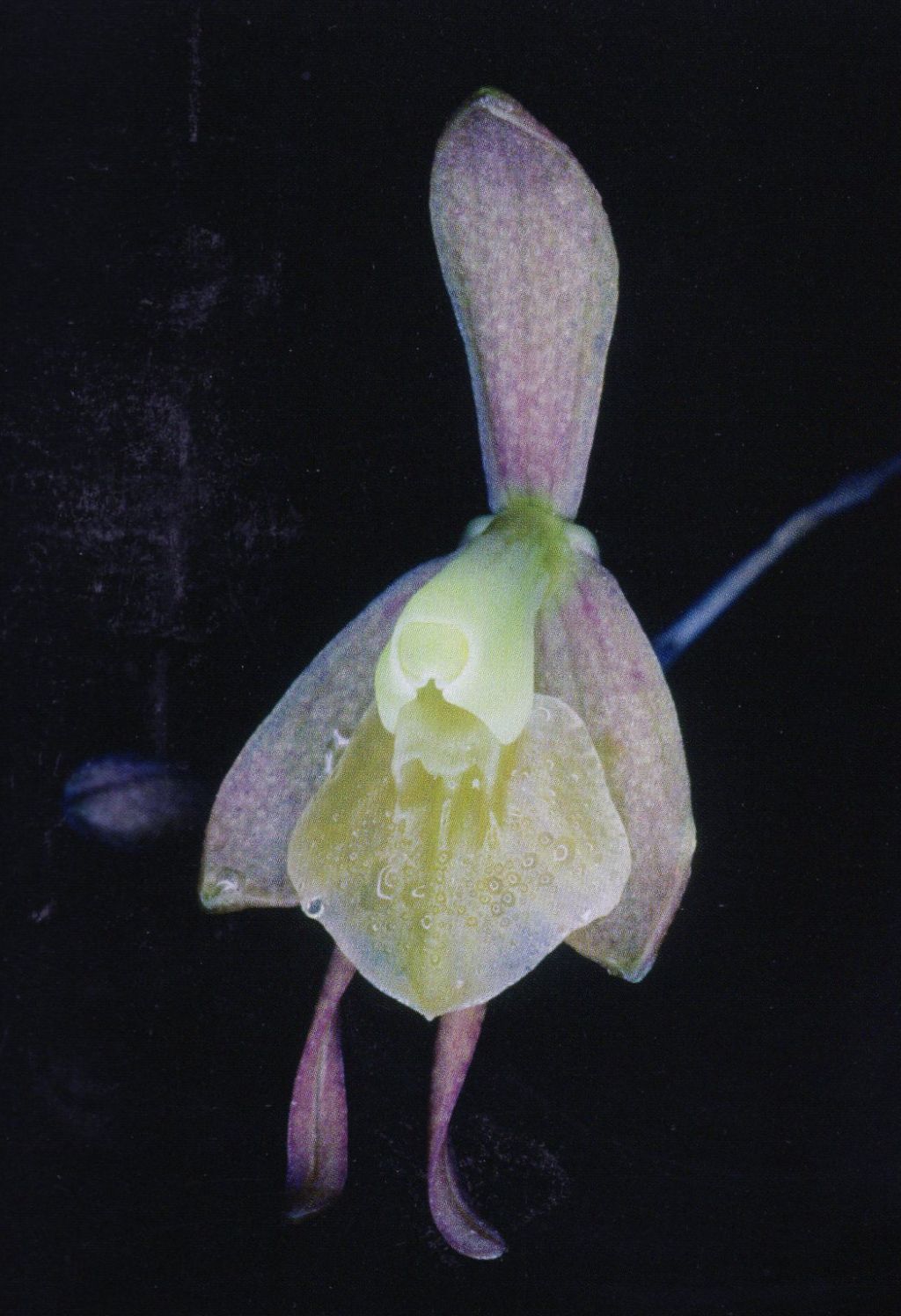Found only in Mexico in pine oak forests at elevations of 2600 to 2700 meters as a cold growing epiphyte with basally sub-terete, laterally compressed above stems carrying 2 to 3, coriaceous, ovate-lanceolate, dorsally carinate leaves that blooms at any time of the year on a terminal, peduncle slender, elongate, laterally compressed, enveloped by papery sheaths, rachis flexuous, glabrous successively single, several flowered inflorescence with shorter than the ovary, triangular, acute floral bracts and carrying greenish purple flowers.