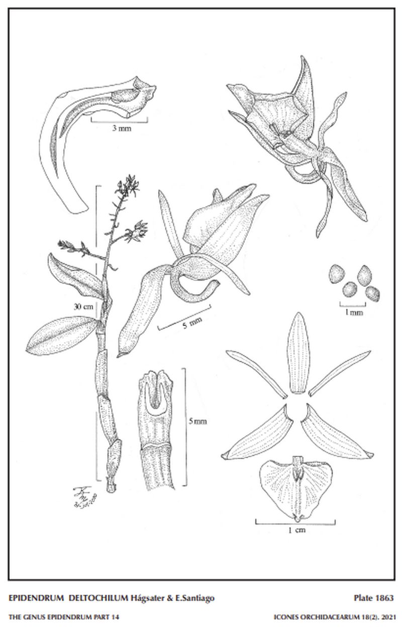 "Epidendrum deltochilum, for which a new group is proposed, the GROUP Deltochilum , is characterized by the sympodial growth, the few leaved stems with an erect paniculate inflorescence with an inflated, acute bract near the base of the peduncle, and the non-resupinate, successive flowers with a triangular lip. The new species is recognized by the simple stems with an erect, paniculate, laxflowered inflorescence, the peduncle short with a tubular, laterally compressed bract in the middle, 26 mm long, flowers non-resupinate, successive, several open at one time, dark olive brown, anther white, the sepals .4 to .44" [10 to 11 mm] long, petals 1-veined, the lip widely triangular, the corners rounded, membranaceous, apex apiculate, the calli narrow, parallel, and the ovary very short, .24 to .48" [6 to 12 mm] long (nearly as long as the sepals). Epidendrum villenae Hágsater & E.Santiago has a 7 to 10 leaved stems, a simple, distichous inflorescence with 3 to 4 bracts distributed along the peduncle, flowers are lilac with a white triangular lip, the ovary slightly inflated behind the perianth, and the sepals .592 to .624" [14.8 to 15.6 mm] long, petals 3-veined, lip with disc short-pubescent. Epidendrum indanzense Hágsater & Dodson has 7 ovate-elliptic leaves, non-infundibuliform sheaths, the inflorescence is elongate, much longer than the stem, with 8 ancipitose bracts sheathing it, and is pluri-racemose, the flowers green, sepals .6" [15 mm] long, and the lip cordiform, minutely papillose, ecallose, the apex obtuse." Hagsater etal 2021