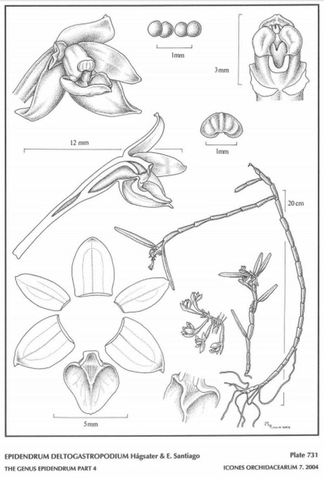 " Epidendrum deltogastropodium belongs to the GROUP Diothonea SUBGROUP Gastropodium, characterized by the branching habit, linear-lanceolate to lanceolate, bilobed leaves, arching-nutant, racemose inflorescence, membranaceous or rarely fleshy flowers, the lip entire to 3-lobed, with an erose margin, ecallose, with or without 1 to 10 thin, smooth to erose keels, the column united to the lip from totally to obliquely to free, the subgroup has small, usually brightly colored flowers, the column ending in fleshy-thickened, lobes. The new species has small, acute floral segments, the sepals .152 to .232" [3.8 to 5.8 mm] long and the triangular-subcordiform lip is truncate at the base and provided with a prominent, "V" shaped, triangular cushion. It is similar to Epidendrum gastropodium which has .24 to .3" [6 to 7.5 mm] long sepals, and the deeply cordate lip has a transverse cushion ending in three short keels. Epidendrum eugenii Schltr. has .212 to .228" [5.3 to 5.7 mm] long sepals and the lip has no cushion but three long, parallel, low keels. Epidendrum melanogastropodium Hágsater & Dodson has wide, rounded floral segments, the sepals .22 to .26" [5.5 to 6.5 mm] long and the lip provided with a transversely elliptic, massive, truncate cushion. Epidendrum mesogastropodium Hágsater & Dodson has acute floral segments, the sepals .2 to .224" [5.0 to 5.6 mm] long, and the cordate lip provided with a fleshy, truncate, transversely elliptic cushion." Hagsater etal 2005