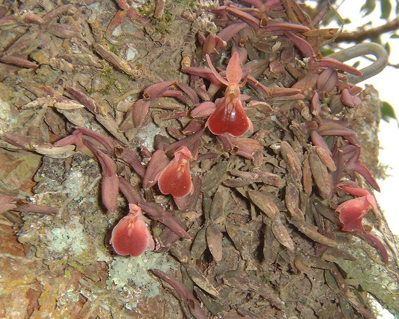 Found in Mexico, Guatemala, Honduras, Nicaragua, Costa Rica, Panama, Colombia, Venezuela, Ecuador, Peru, Bolivia and Brazil in wet montane and cloud forests at elevations of 400 to 1800 meters as a mini-miniature sized, hot to cool growing, mat-forming epiphyte with simple, cane-like , laterally compressed, somewhat reclining stems carrying 4 to 13, all along the stem, disitchous, spreading, slightly arching, narrowly ovate-lanceolate, sometimes conduplicate, subacute, margin minutely ciliate at the apex, articulate below into the base leaves that blooms in the late spring through winter on a terminal, sessile, single flowered inflorescence arising through a hemi-elliptic, ovate-lanceolate, rounded and slightly oblique apically spathaceous bracts and carrying, fragrant, resupinate, fleshy flowers.